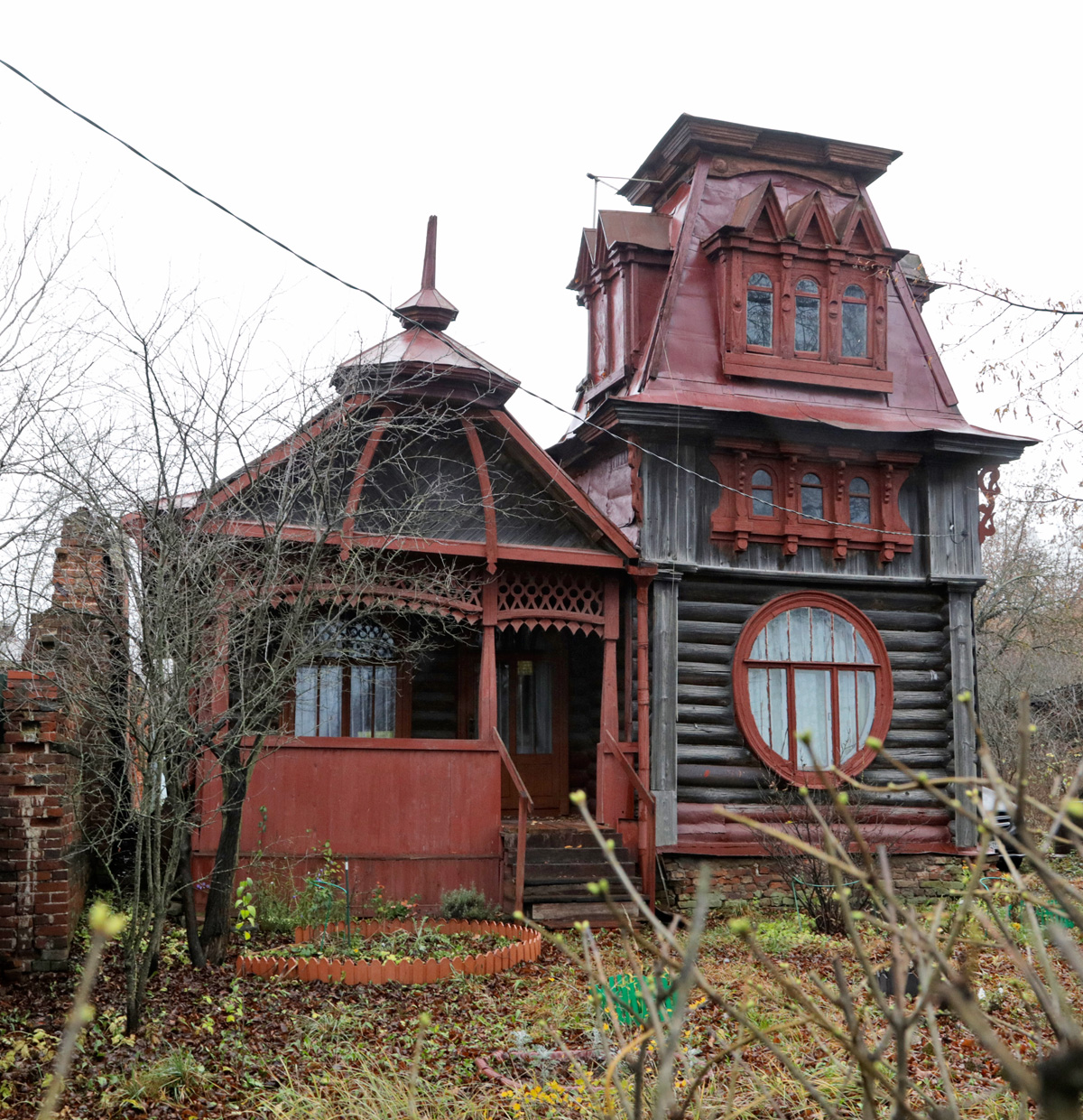 Внизу, под пирамидой-шатром, на фоне ещё более древней по пластическому выражению бревенчатой стены, вдруг возникает неожиданно большое овальное окно - главный элемент композиции в нижней части здания. Окно воспринимается как некий циклопический иллюминатор, освещающий громадный интерьер. А на самом деле за ним - крохотная комнатка площадью 6 кв. метров. Опять возникает иллюзия, т.е. обращение к воображению, а не воспроизведение реальности, уход от утилитарности. Ведь это окно освещает не только крохотный интерьер. Главное - оно, если можно так выразиться, «светит в далёкое будущее», когда подобный мотив станет символом архитектуры XX века.